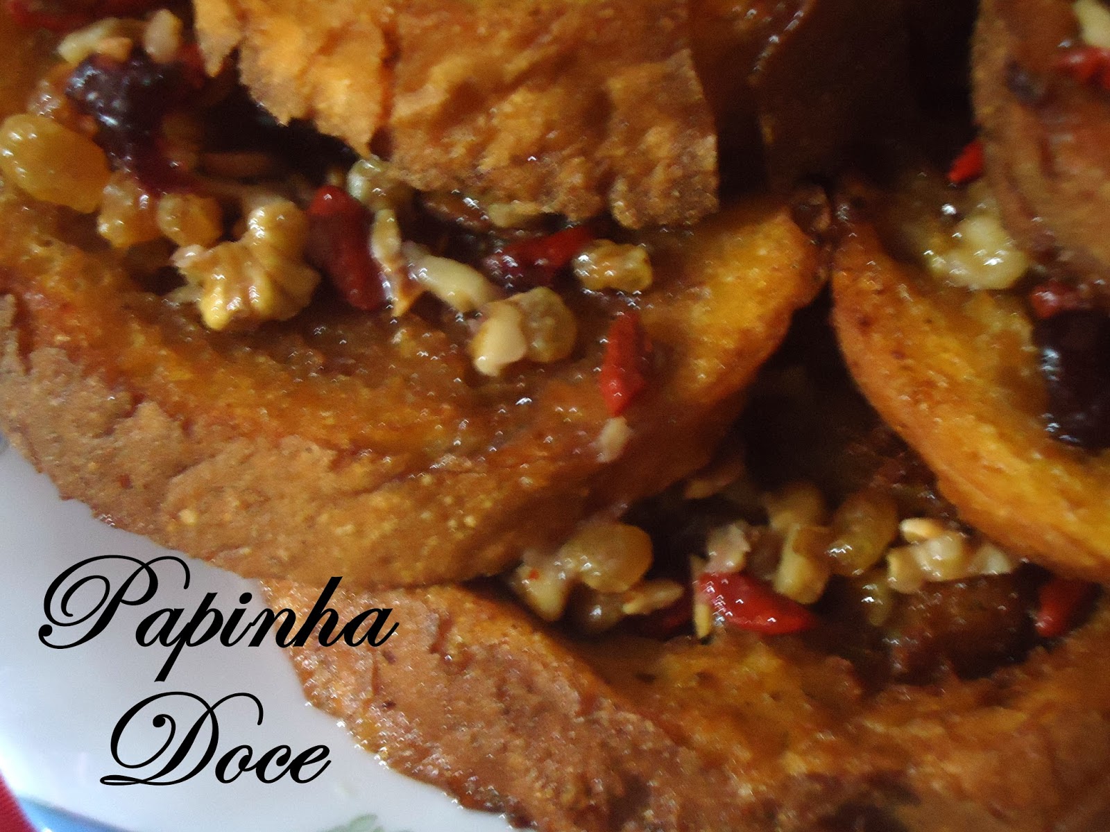 Depois de fritas e escorridas em papel cozinha absorvente, coloque-as num prato de servir e vaze a calda dos frutos secos, por cima.